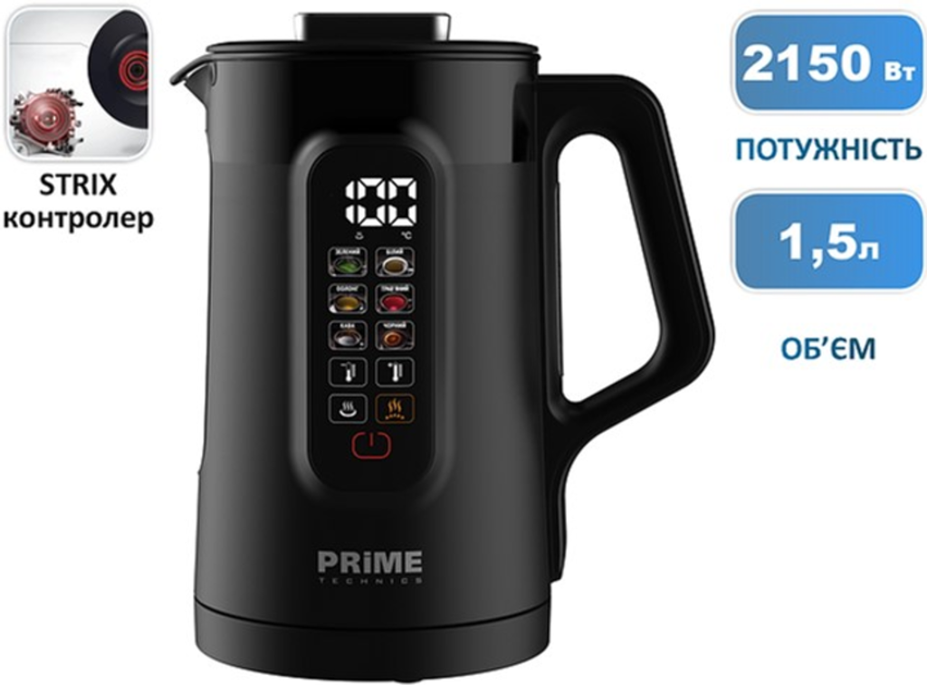 Електрочайник PRIME Technics PKD 1598 BG поєднує в собі потужність 2150 Вт і об'єм 1,5 л, забезпечуючи швидке та ефективне нагрівання води.