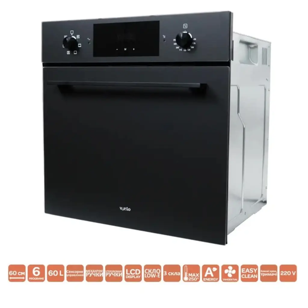 Духова шафа Ventolux EO60TC-6P MBG — це ідеальне рішення для сучасної кухні, яке поєднує вишуканий мінімалістичний дизайн із матового чорного скла з широким набором функцій. Ця модель створена для тих, хто цінує не лише естетику, але й високу ефективність у приготуванні.
