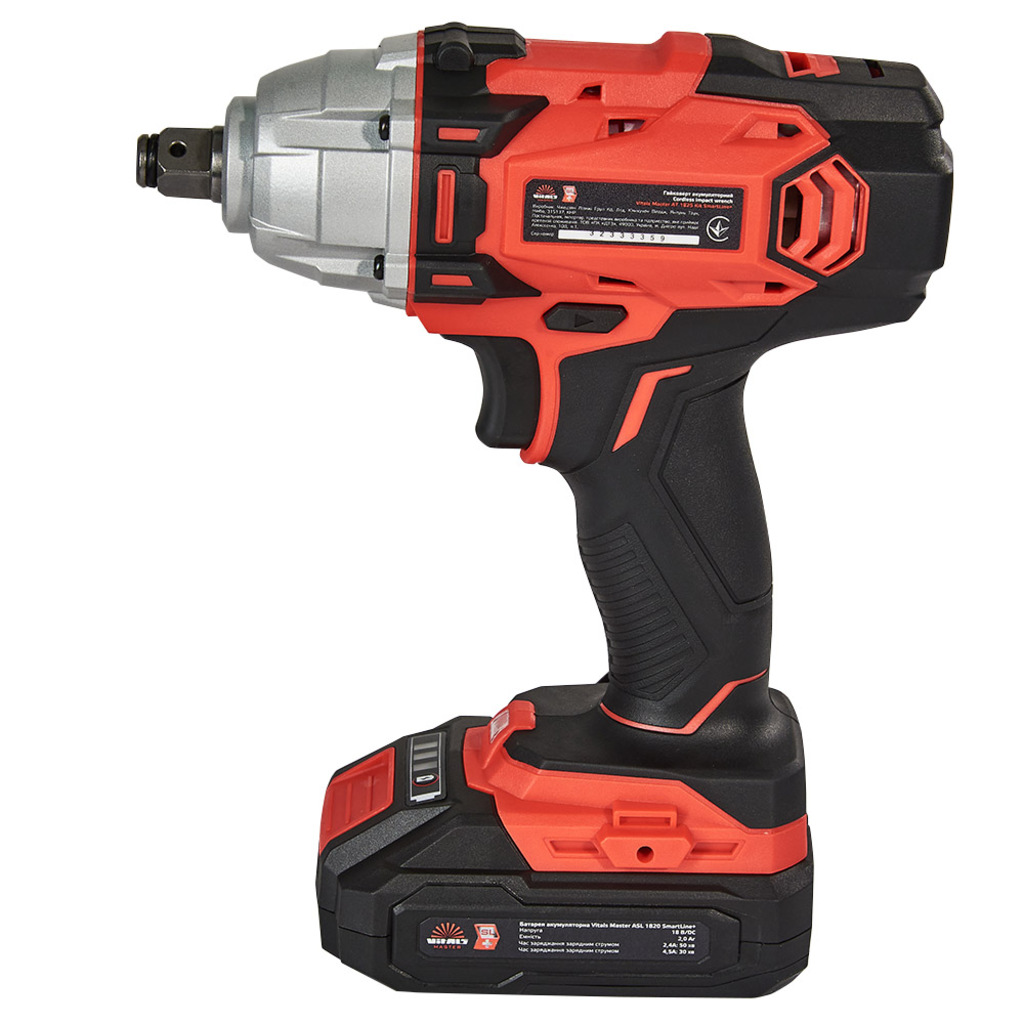 Гайкокрут акумуляторний Vitals Master AT 1825 Kit SmartLine+ пропонує не тільки потужність, але й зручність використання. У комплекті з акумулятором та зарядним пристроєм ви зможете продовжувати роботу без переривання і легко підтримувати заряд акумулятора.