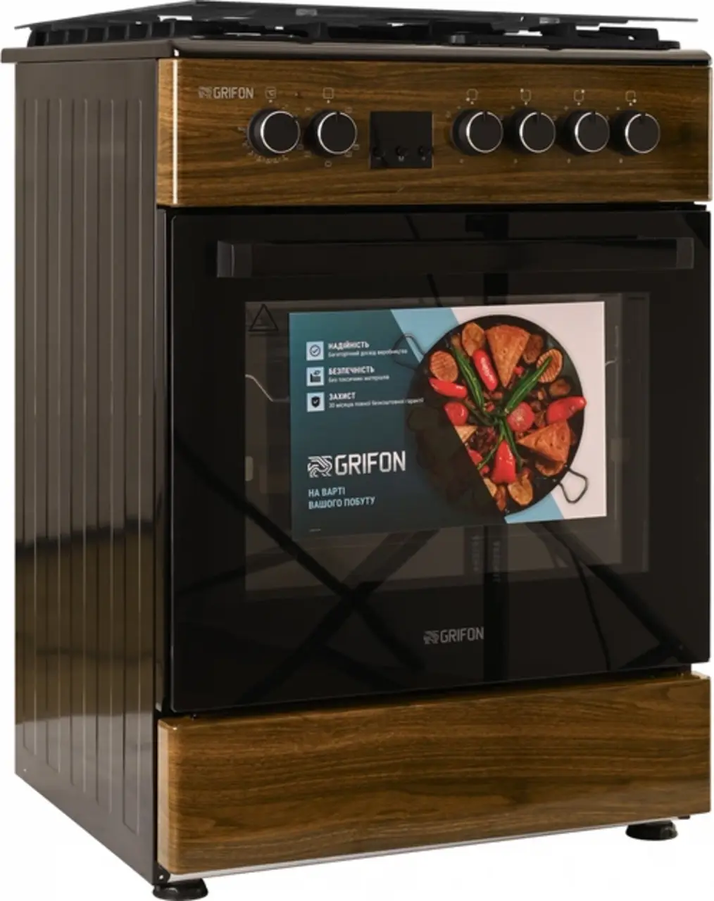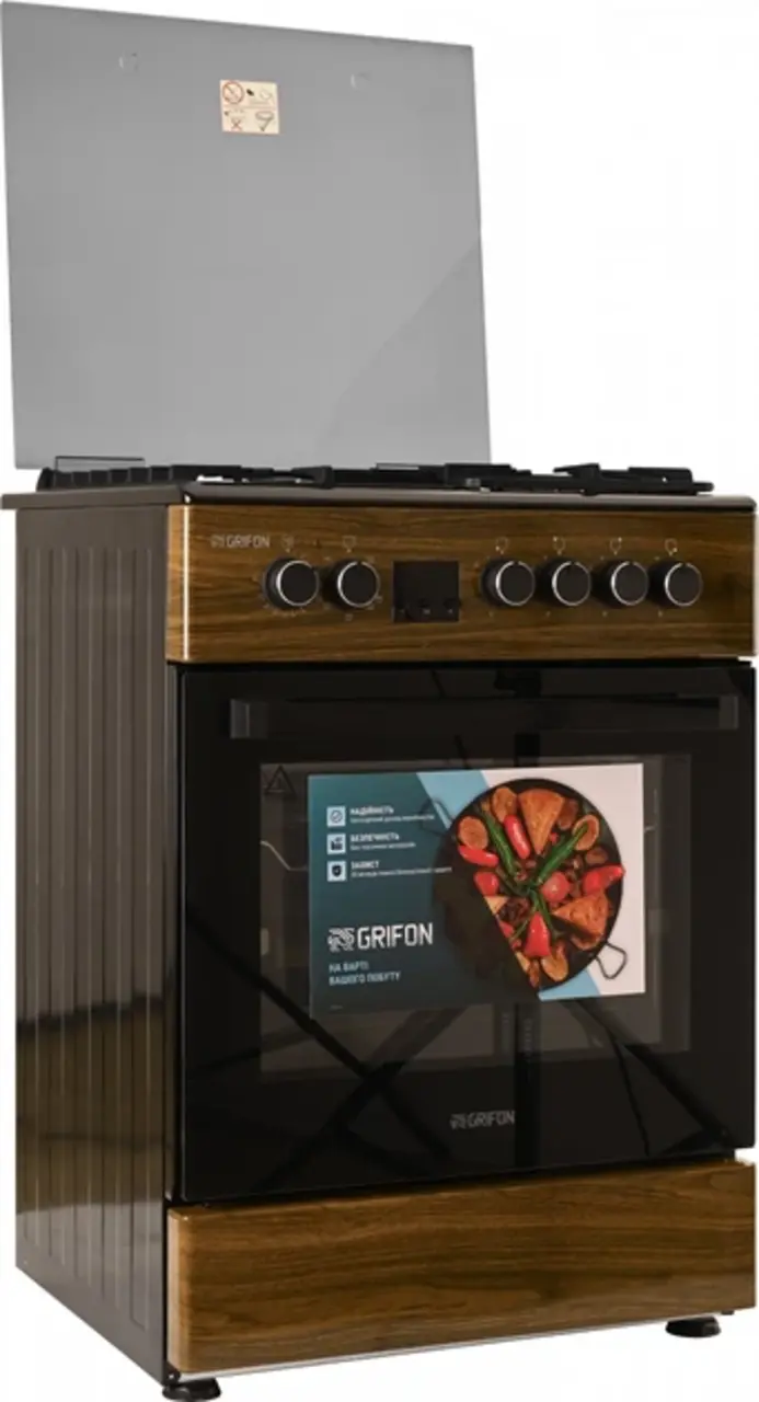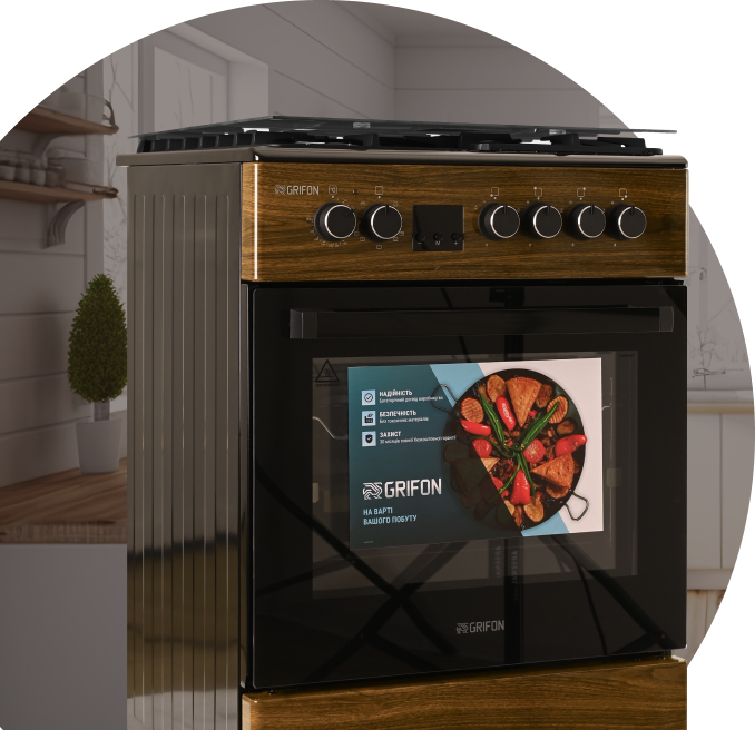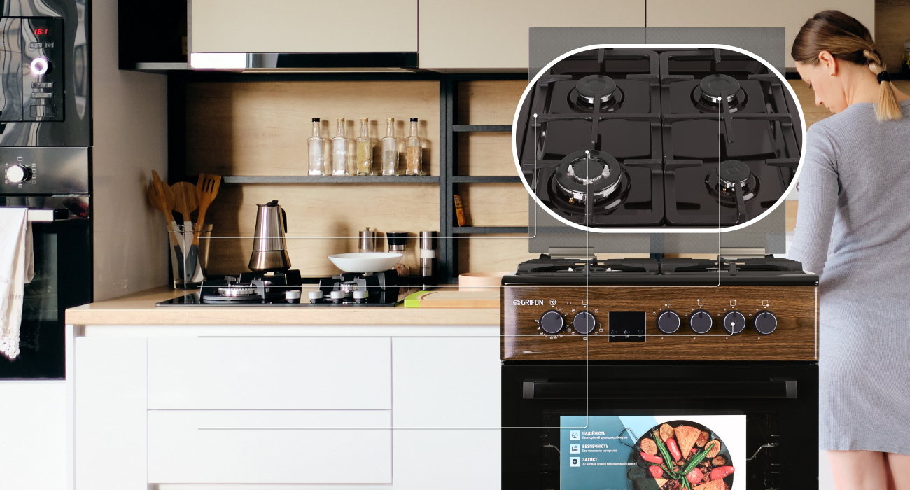 Всі плити Grifon оснащені функцією газ-контролю. Це означає, що витік газу при затуханні газової конфорки виключений, подача газу припиняється одразу при затуханні полум’я.
