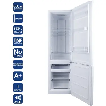 Холодильник Ventolux RF 201-326 TNF WH — це зручна і функціональна двокамерна модель із загальним об'ємом 319 літрів, що включає холодильне відділення на 243 л і морозильне — на 76 л. Повна система No Frost у обох камерах гарантує відсутність інею та мінімум зусиль для догляду, що робить експлуатацію приладу особливо комфортною.