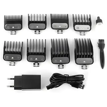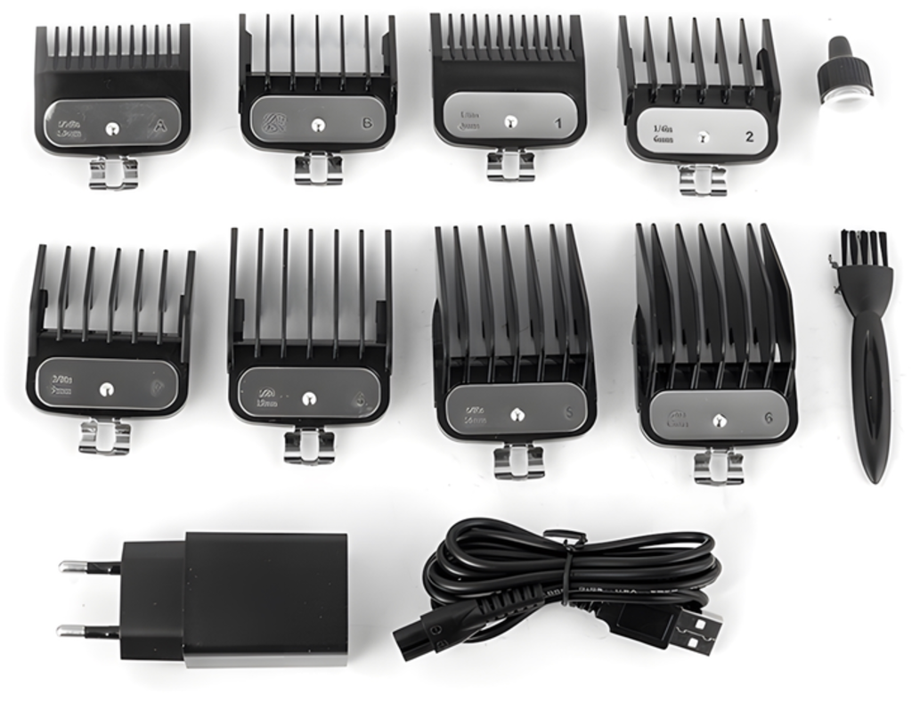 - Кілька змінних насадок-гребнів для різноманітних стилів стрижки.