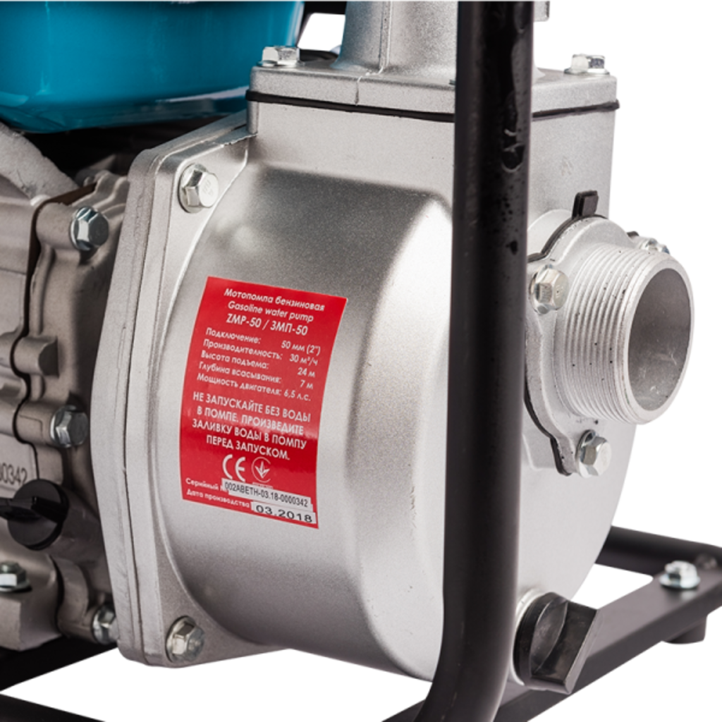 Мотопомпа бензинова ЗЕНИТ ЗМП-50 з 4-тактним одноциліндровим електродвигуном потужністю 6,5 к.с. і ємністю паливного бака до 3,6 л має високу продуктивність і здатна до швидкого перекачування води до 500 л/хв, 30 (м³/год). Паливом для роботи є бензин марки АИ-92.