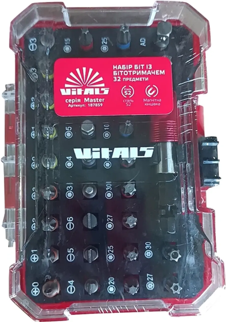 Набір біт з тримачем 32 предметів Vitals Master призначений для монтажу та демонтажу різьбових з'єднань з різними типами шліців. Довжина насадок складає 25 мм. Використовується як у ручному інструменті, так і з шурупокрутами завдяки універсальному шестигранному хвостовику 1/4”. Є кольорове маркування біт для їх швидкого вибору. Насадки виготовлені з високоміцної сталі S2, яка відрізняється довговічністю і не схильна до руйнування. У складі цієї сталі є молібден і кремній, які надають виробу високий опір до навантажень і низький поріг оборотної деформації.