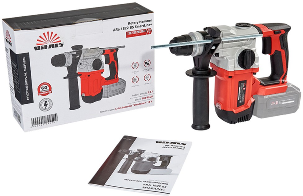Акумуляторний перфоратор Vitals Professional ARa 1822 BS SmartLine+ оснащений безщітковим двигуном, який забезпечує підвищену продуктивність, довговічність і ефективність роботи. Завдяки високій силі удару та патрону SDS-plus, цей перфоратор може впоратися з найважчими матеріалами, включаючи бетон та цеглу. Оснащення LED підсвічуванням дозволяє покращити видимість робочої зони, особливо під час роботи в погано освітлених умовах. Алюмінієвий корпус редуктора забезпечує міцність та надійність інструменту, захищаючи його від пошкоджень під час використання.