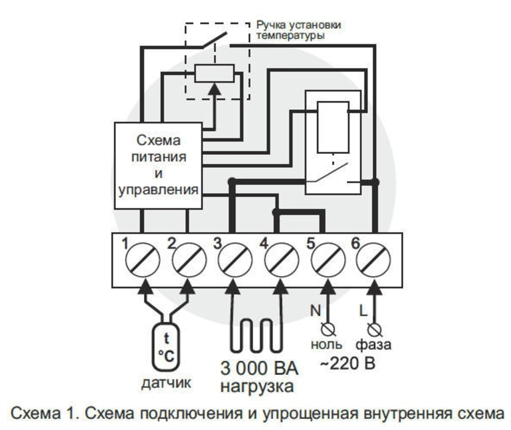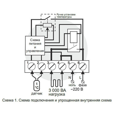 Датчик температури підключається до клем 1 і 2. Напруга живлення (220 В ±10 %, 50 Гц) подається на клеми 5 та 6, причому фаза (L) визначається індикатором і підключається на клему 6, а нуль (N) — на клему 5. До клем 3 і 4 підключається навантаження (з'єднувальні дроти від нагрівального елемента).