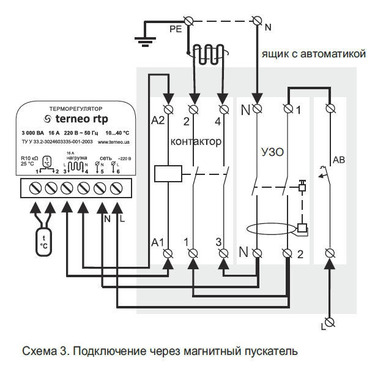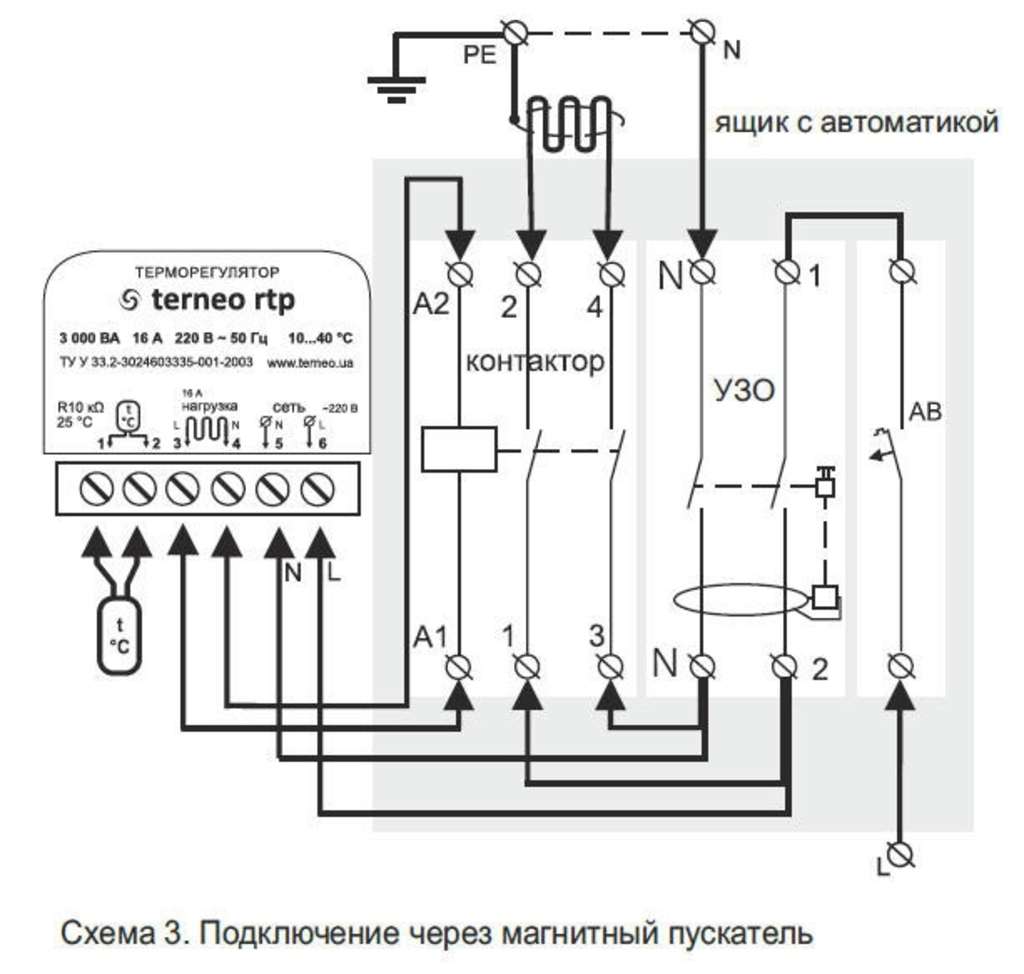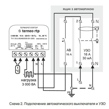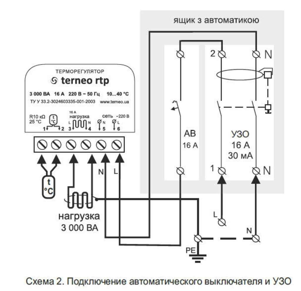 Монтується термостат для електропідлоги Terneo rtp на стіні у монтажну коробку діаметром 60 мм. Перетин проводки для підключення терморегулятора для теплої підлоги terneo rtp має бути не менше: для алюмінію – 2х1,5 мм², для меді – 2х1 мм². Перед термореле, у розрив фазного дроту, потрібно поставити автоматичний вимикач на 16 А. У приміщеннях, де працює система «тепла підлога», потрібно обов'язково ставити ПЗВ (пристрій захисного відключення), – схема підключення описано в інструкції. Клеми з затискними болтами розраховані на переріз проводу живлення 2,5 мм². Рекомендується використовувати м'який кабель, типу ПВС, щоб зменшити навантаження на клеми, та мінімізувати ризик послаблення контакту.
