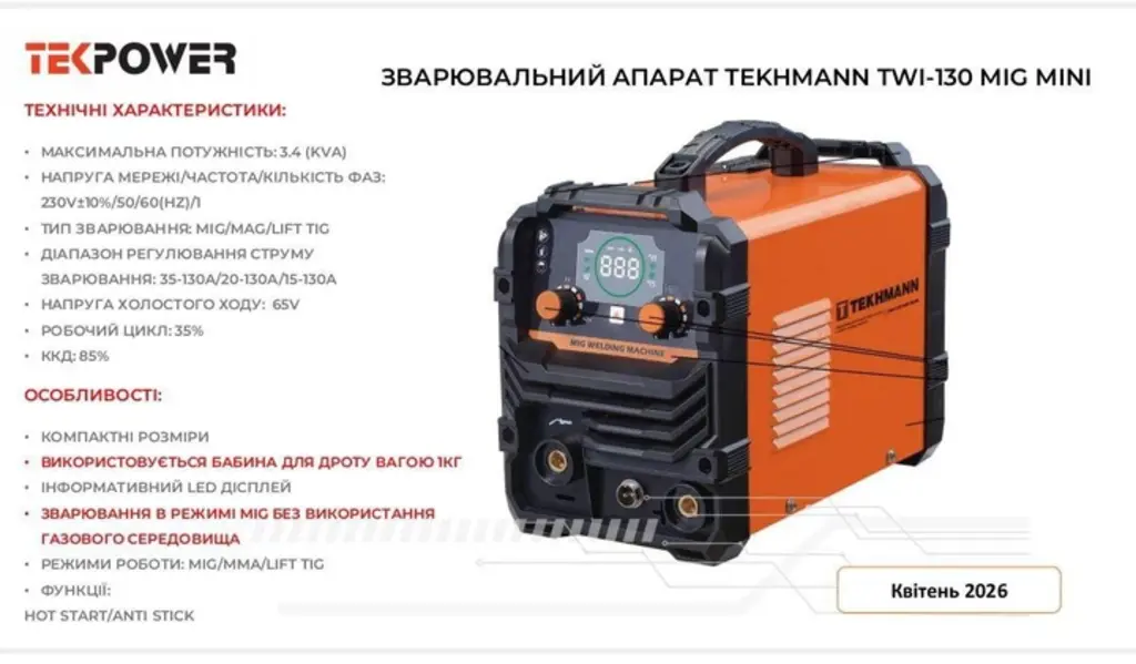 - Зварювальний апарат інверторний, модель "TWI-130 MIG mini ": 1 шт.